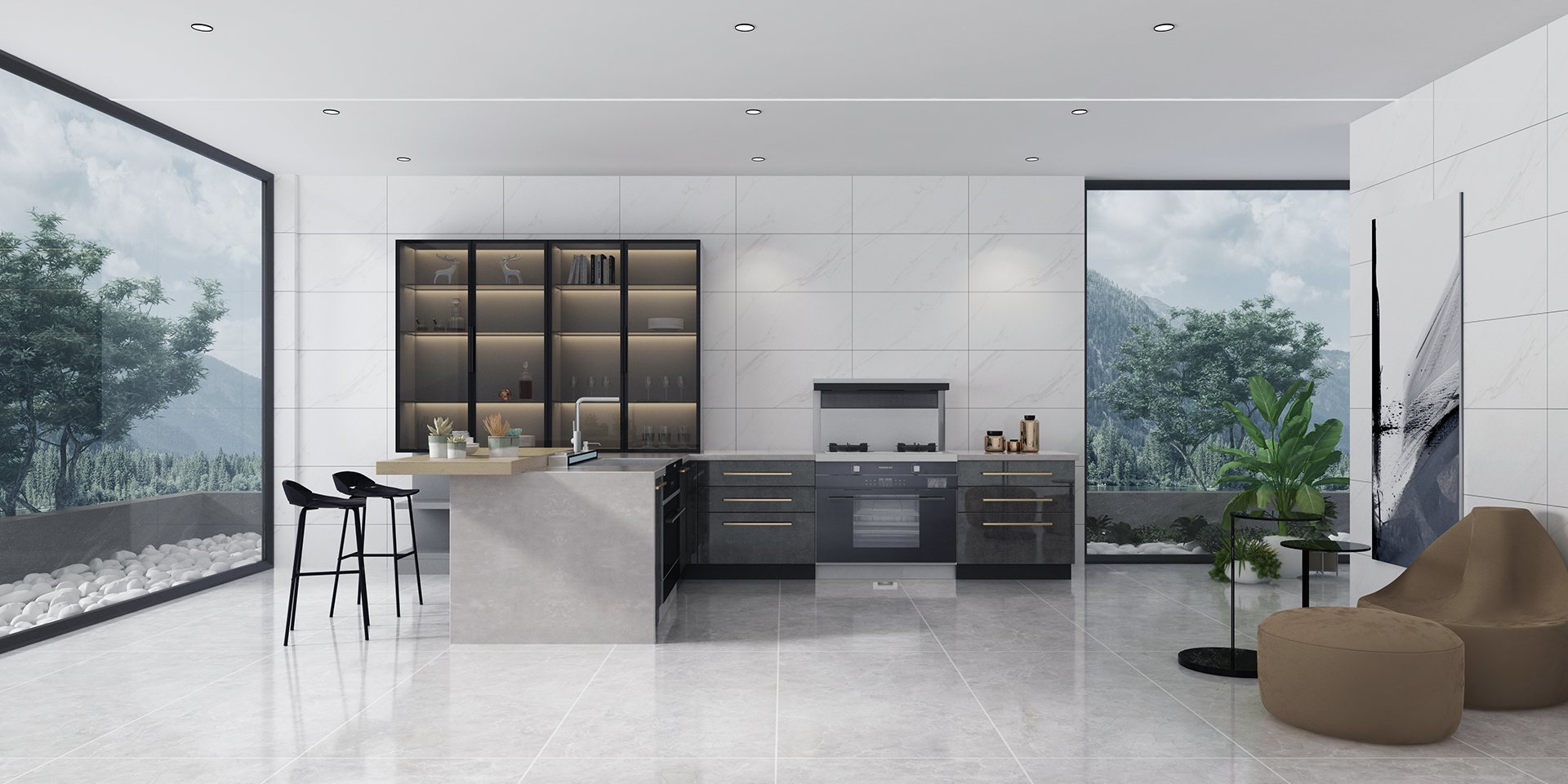 大面積白色彩基調呈現出自然溫潤的一面,其間有若淺灰色條紋穿插其中